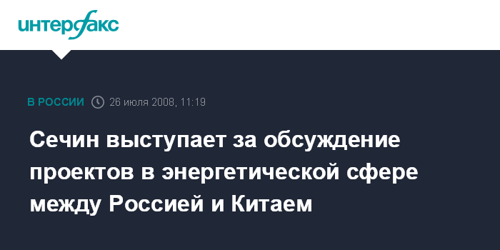 Москва. 26 июля. INTERFAX.RU - Механизм регулярных консультаций между Россией и Китаем станет "инструментом, который может помочь в реализации крупных проектов в энергетической сфере", заявил в субботу в Пекине заместитель председателя правительства РФ Игорь Сечин на переговорах с вице-премьером Госсовета КНР Ван Цишанем.