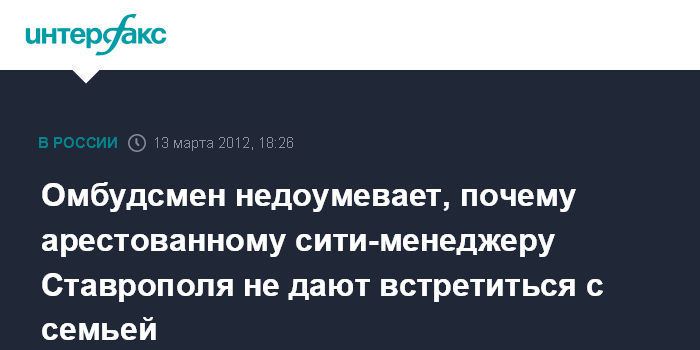 Ставрополь. 13 марта. INTERFAX.RU - Уполномоченный по правам человека в Ставропольском крае Алексей Селюков считает, что следствие не должно препятствовать встрече арестованного по подозрению в покушении на получение взятки сити-менеджера Ставрополя Игоря Бестужего с женой.