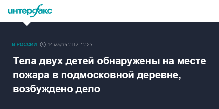 Москва. 14 марта. INTERFAX.RU - Уголовное дело о нарушении пожарной безопасности возбуждено в Подмосковье по факту пожара в деревне Нефедово Серпуховского района, в результате которого погибли двое детей, сообщил официальный представитель СК РФ Владимир Маркин. "В настоящее время на месте происшествия работает следственно-оперативная группа. Обнаружены тела погибших. Назначены экспертизы. Возбуждено уголовное дело по ст.219 УК РФ (нарушение требований пожарной безопасности, повлекшее смерть)", - сказал Маркин в среду "Интерфаксу".