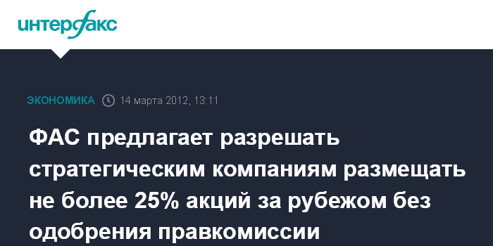Москва. 14 марта.INTERFAX.RU - ФАС предлагает разрешать стратегическим компаниям размещать не более 25% акций на зарубежных биржах без одобрения правительственной комиссии по контролю за осуществлением иностранных инвестиций в стратегические отрасли, сообщил журналистам глава ведомства Игорь Артемьев.