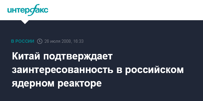 Москва. 26 июля. INTERFAX.RU - Китайская сторона подтвердила в субботу большую заинтересованность в приобретении в России ядерного реактора на быстрых нейтронах, сообщил в субботу агентству "Интерфакс-Китай" информированный российский источник.