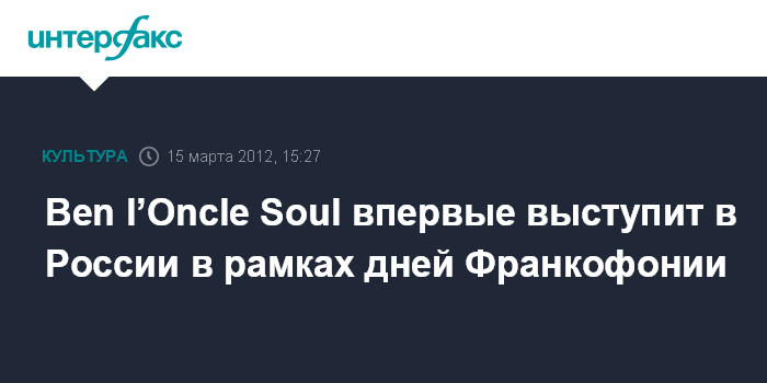 Москва. 15 марта. INTERFAX.RU – Молодой стильный музыкант из Франции Ben l’Oncle Soul (Бен л’Онкль Соул), второй год собирающий аншлаги в Европе, впервые выступит в России. Концерты новой звезды соула пройдут 30 марта 2012 года в петербургском клубе "Космонавт" и 31 марта в концертном зале "Крокус Сити Холл" в Москве в рамках дней франкофонии при поддержке посольства Франции.