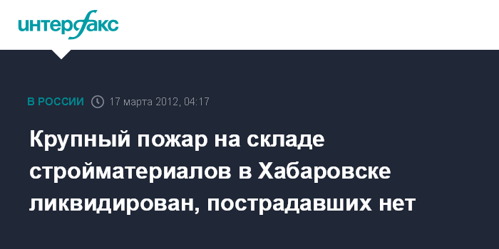 Хабаровск. 17 марта. ИНТЕРФАКС-ДАЛЬНИЙ ВОСТОК - Крупный пожар на складе стройматериалов в Хабаровске ликвидирован, сообщила в субботу агентству "Интерфакс-Дальний Восток" представитель пресс-службы ГУ МЧС по Хабаровскому краю Анастасия Котова.