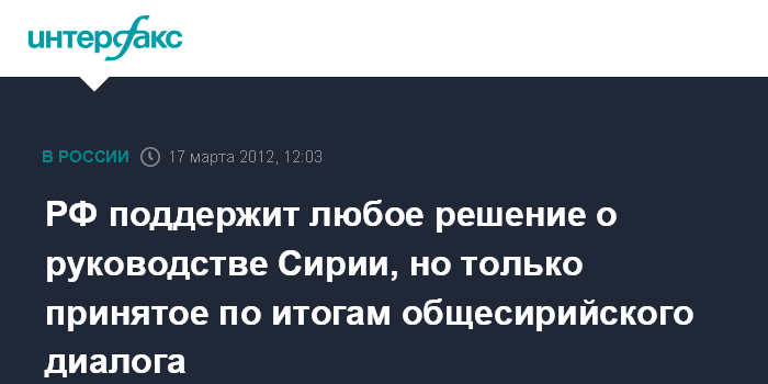 Москва. 17 марта. INTERFAX.RU - Россия поддержит любое решение о руководстве Сирии, но только принятое по итогам общесирийского политического диалога.