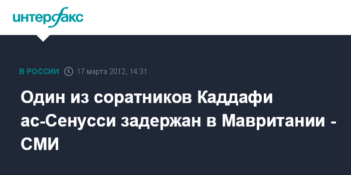Тунис. 17 марта. INTERFAX.RU - Бывший руководитель ливийской службы разведки Абдулла ас-Сенусси задержан в ночь на субботу в международном аэропорту столицы Мавритании, сообщает агентство АФП со ссылкой на источники в местных службах безопасности. А.Ас-Сенусси - один из ближайших соратников покойного ливийского лидера Муамара Каддафи. Его разыскивает Международный уголовный суд. По данным агентства, А.ас-Сенусси прибыл в Нуакшот рейсом из Касабланки (Марокко). У него обнаружен поддельный малийский паспорт.