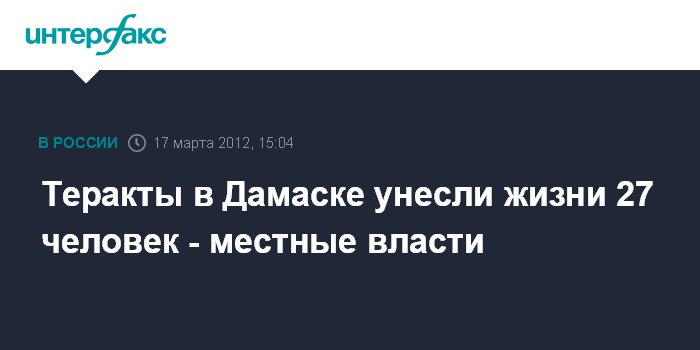 Бейрут. 17 марта. INTERFAX.RU - Не менее 27 человек погибли и 97 получили ранения в результате произошедших в субботу терактов в Дамаске, сообщает сирийское государственное телевидение со ссылкой на министерство здравоохранения страны.