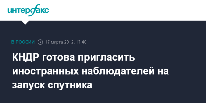 Сеул. 17 марта. INTERFAX.RU - Власти Северной Кореи готовы допустить иностранных наблюдателей и журналистов на запланированный на апрель запуск спутника, сообщает в субботу северокорейское агентство ЦТАК. "Северокорейский комитет по космическим технологиям пригласит иностранных экспертов, хорошо разбирающихся в данной тематике, а также журналистов, на запланированный на следующий месяц запуск спутника", - говорится в сообщении.
