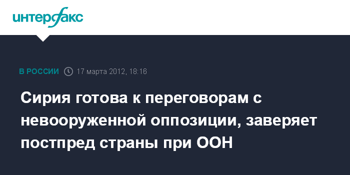 Нью-Йорк (ООН). 17 марта. INTERFAX.RU - Постоянный представитель Сирии при ООН Башар Джаафари в интервью телеканалу RT на арабском языке - "Русия аль-Яум" заверил, что в Дамаске готовы к переговорам с оппозиционерами, не оказывающими вооруженного сопротивления властям.