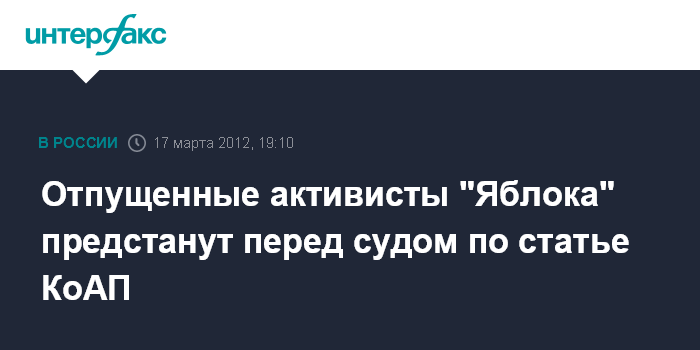 Москва. 17 марта. INTERFAX.RU - Задержанные полицией в Москве активисты "Яблока" отпущены, их ждет суд и, возможно, штраф, сообщает сайт партии. "Задержанным на акции солидарности с кубанскими экологами московским активистам партии "Яблоко" предъявлено обвинение в нарушении общественного порядка. В их отношении возбуждены административные дела по ч. 2 ст. 20.2 КоАП (нарушение установленного порядка проведения пикетирования). Максимальная санкция по этой статье - штраф 1000 рублей", - говорится в сообщении.