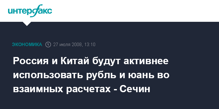 Москва. 27 июля. INTERFAX.RU - Россия и Китай договорились об активизации использования национальных валют двух стран во взаимных расчетах в торгово-экономической деятельности, заявил в воскресенье в Шанхае заместитель председателя правительства России Игорь Сечин.