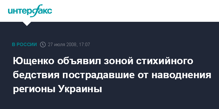 Москва. 27 июля. INTERFAX.RU - Президент Украины Виктор Ющенко объявил зоной стихийного бедствия пострадавшие от наводнения западные регионы страны.