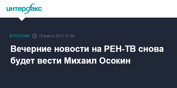 "Михаил Осокин снова вести вечерние новости на нашем телеканале", - сообщила в понедельник "Интерфаксу" пресс-секретарь телеканала РЕН-ТВ Анастасия Шульга.