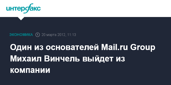 Москва. 20 марта. INTERFAX.RU - Один из основателей интернет-компании Mail.ru Group Ltd. Михаил Винчель намерен продать свою долю в ее уставном капитале - 1,5%.