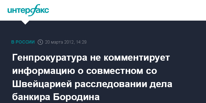 При этом, касаясь сообщения о том, что швейцарские следователи начали собственное расследование в отношении банкира Бородина, который уже является фигурантом уголовного дела в России, источник заявил: "Ни подтверждать, ни опровергать эту информацию мы не будем".