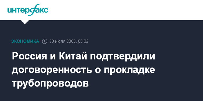 Москва. 28 июля. INTERFAX.RU - Россия и Китай подтвердили готовность и стремление к строительству ответвления от нефтепровода Восточная Сибирь - Тихий океан (ВСТО) на Китай, а также газопровода "Алтай", заявил агентству "Интерфакс-Китай" начальник управления внешних связей Китайской национальной нефтегазовой корпорации (СNPC) Чжан Синь.