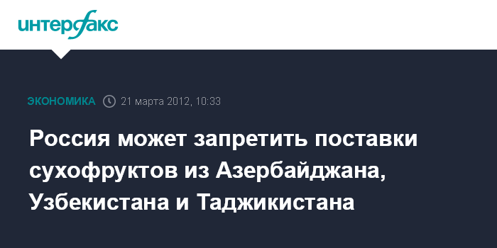 Москва. 21 марта. INTERFAX.RU - Россельхознадзор может запретить поставки продукции растениеводства, прежде всего сухофруктов, из Азербайджана, Узбекистана и Таджикистана, сообщила служба.