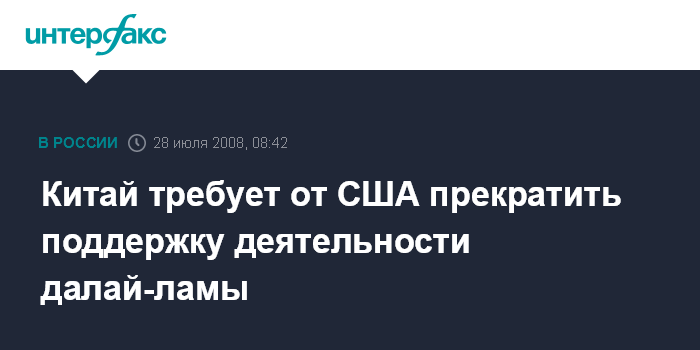 Москва. 28 июля. INTERFAX.RU - Китай озабочен состоявшейся 25 июля встречей кандидата в президенты США от Республиканской партии Джона Маккейна с находившимся в США далай-ламой и требует от соответствующих американских представителей прекратить его поддержку, заявил в понедельник официальный представитель КНР Лю Цзяньчао.