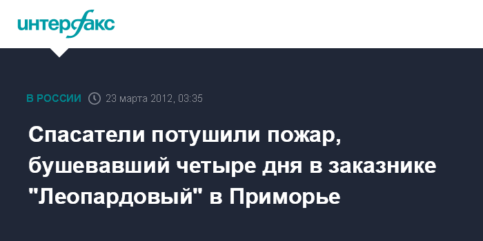 Как сообщалось, во вторник пожаром было охвачено около 1,5 тыс. га в центральной части заказника "Леопардовый" в Хасанском районе Приморского края. В среду образовался еще один очаг огня. Фронт его составил около четырех километров. По данным сотрудников заповедника "Кедровая падь", в ведении которого находится заказник, пожар был ликвидирован в среду. Горели, главным образом, трава, кустарник, отдельно стоящие деревья. По данным независимых экологов WWF - горел лес. Предварительная причина пожара - поджог.