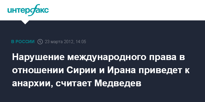 В пример Медведев привел события вокруг Ирана и Сирии. Он предупредил, что попытки обойти международное право при решении этих проблем приведут к анархии. По его словам, "какими бы благими намерениями ни были продиктованы попытки навязать свое мнение, свою волю несогласным, они несовместимы с принципами международного партнерства, взаимного уважения в международных отношениях".
