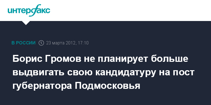 Москва. 23 марта. INTERFAX.RU - Губернатор Московской области Борис Громов принял решение обратиться в высший совет партии "Единая Россия" с просьбой не рассматривать его в качестве одного из кандидатов на пост губернатора региона на следующий период, сообщает пресс-служба Громова в пятницу.