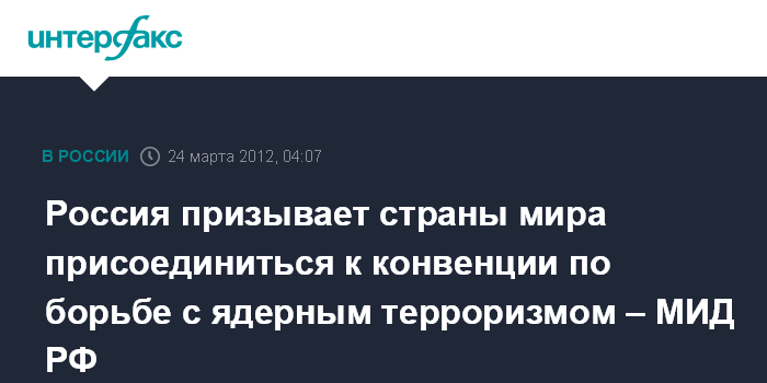 "Россия подписала и ратифицировала конвенцию о физической защите ядерных материалов и поправку к ней, а также принятую международным сообществом по российской инициативе конвенцию по борьбе с актами ядерного терроризма. Призываем другие государства, которые еще этого не сделали, ускорить завершение внутренних процедур по присоединению к этим важнейшим международным инструментам", - говорится в статье, вышедшей в преддверии саммита по ядерной безопасности, который пройдет в Сеуле 25-27 марта.
