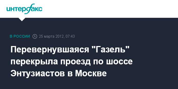 Москва. 25 марта. ИНТЕРФАКС - Перевернувшая в результате ДТП "Газель" перекрыла шоссе Энтузиастов в сторону Московской области, сообщил "Интерфаксу" источник в правоохранительных органах.