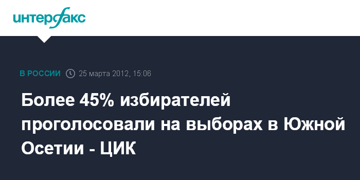 Цхинвал. 25 марта. INTERFAX.RU - На повторных выборах президента Южной Осетии проголосовала почти половина избирателей, заявила журналистам глава Центризбиркома республики Белла Плиева. "По данным на 14:00 мск на выборах проголосовали 45,3% избирателей. Таким образом, на выборах проголосовала почти половина избирателей", - заявила она.