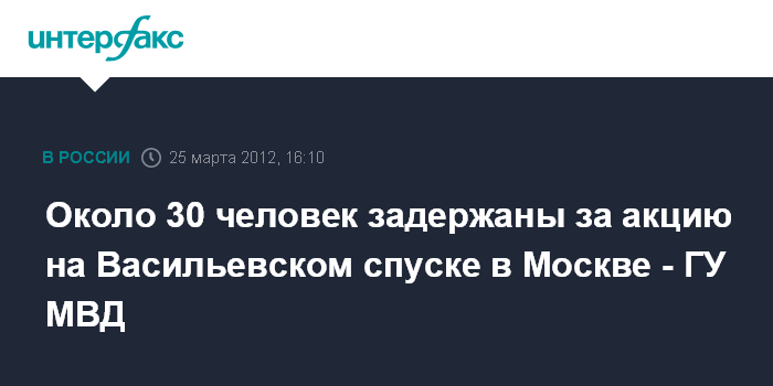 Москва. 25 марта. INTERFAX.RU - Полиция задержала около 30 человек за попытку проведения несанкционированной акции в Москве на Васильевском спуске, сообщили "Интерфаксу" в пресс-службе ГУ МВД России по Москве. "За попытку проведения несанкционированной акции на Васильевском спуске в воскресенье днем были задержаны около 30 человек", - сказали в пресс-службе.