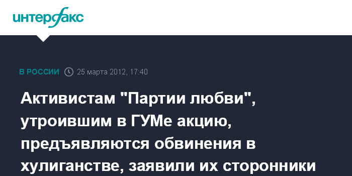 Москва. 25 марта. INTERFAX.RU - Активисты незарегистрированной "Партии любви", устроившие несанкционированную акцию в ГУМе, доставлены в ОВД "Китай-город", им предъявляется обвинение в хулиганстве, сообщил основатель партии, экс-мэр Архангельска Александр Донской. "Четверо парней и одна девушка задержаны сотрудниками полиции и доставлены в ОВД "Китай-город". В данный момент им предъявляют обвинение по статье хулиганство", - заявил А.Донской "Интерфаксу" в воскресенье.