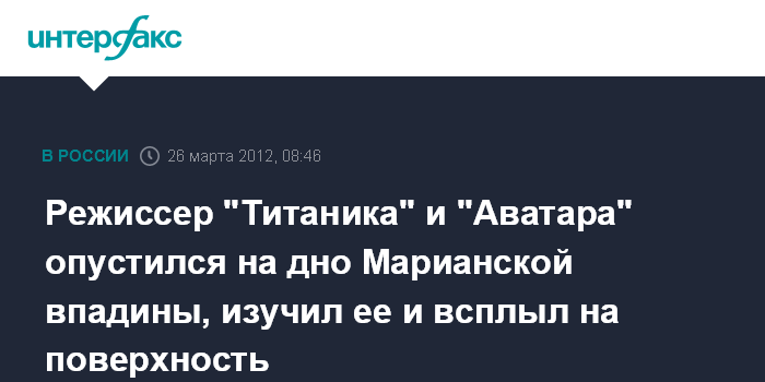 Москва. 26 марта. INTERFAX.RU - Голливудский режиссер Джеймс Кэмерон поднялся на поверхность Тихого океана после погружения на дно самой глубоко точки мирового океана - Марианской впадины, сообщает в понедельник британская телерадиовещательная корпорация ВВС.
