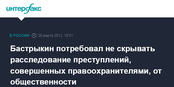 Москва. 26 марта. INTERFAX.RU - Глава Следственного комитета РФ Александр Бастрыкин потребовал от подчиненных уделять особое внимание расследованиям преступлений, совершаемых сотрудниками правоохранительных органов, сообщил "Интерфаксу" официальный представитель СК РФ Владимир Маркин в понедельник. Бастрыкин также добавил, что результаты расследований не должны скрываться от общественности.
