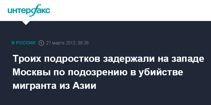 Москва. 27 марта. INTERFAX.RU - Московская полиция на западе столицы по подозрению в убийстве задержала троих подростков, сообщил "Интерфаксу" во вторник источник в правоохранительных органах.