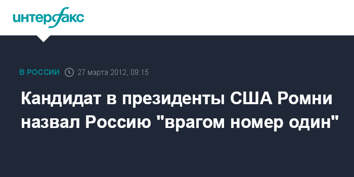 Москва. 27 марта. INTERFAX.RU - Бывший губернатор Массачусетса, кандидат в президенты США от республиканской партии Митт Ромни назвал Россию "врагом номер один".