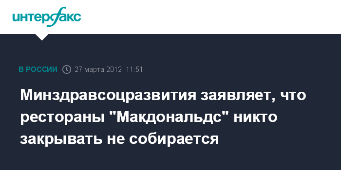 На вопрос "Интерфакса", соответствует ли действительности версия о том, что Минздравсоцразвития и Роспотребнадзор пришли к выводу о том, что эта ресторанная сеть должна быть закрыта, Скворцова ответила: "Нет".