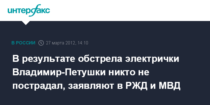 Владимир. 27 марта. INTERFAX.RU - В РЖД и в Главном управлении МВД на транспорте опровергают информацию о пострадавшем в результате обстрела пригородного поезда Владимир-Петушки. "Никто из пассажиров не пострадал. В настоящее время решается вопрос о возбуждении уголовного дела по факту порчи имущества железной дороги", - сообщили в пресс-службе ОАО "РЖД".