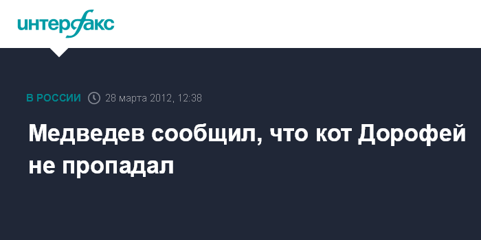 Москва. 28 марта. INTERFAX.RU - Президент России Дмитрий Медведев опроверг информацию о пропаже кота.