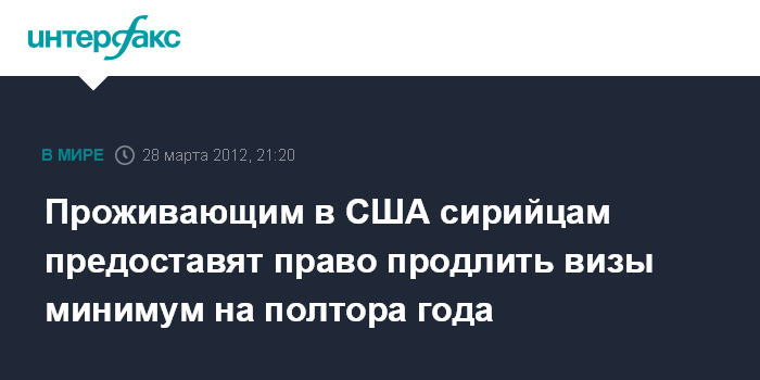 Дубай. 28 марта. INTERFAX.RU - Около 3 тыс. сирийских граждан, временно проживающих в США, получат право продлить срок действия своих виз минимум на полтора года в связи с событиями в Сирии, сообщает в среду межарабский телеканал "Аль-Арабийя".