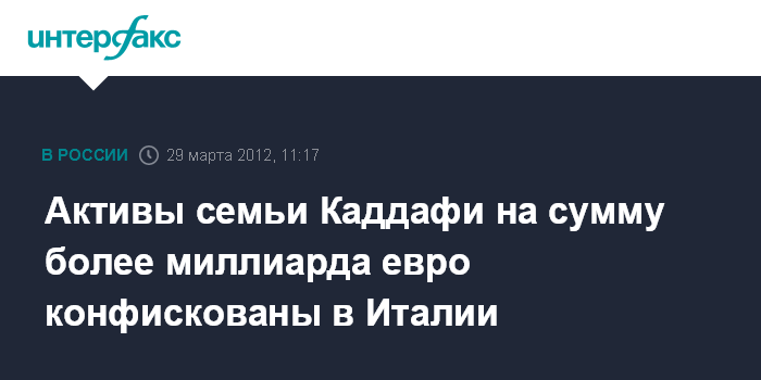 Лондон. 29 марта. INTERFAX.RU - Активы стоимостью более 1 млрд евро, принадлежавшие покойному лидеру Ливии Муамару Каддафи, его сыну, а также бывшему главе спецслужб страны Абдулле ас-Сенусси, конфискованы в Италии по инициативе Международного уголовного суда (МУС), сообщает в четверг британская газета The Guardian.