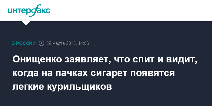Москва. 29 марта. INTERFAX.RU - Глава Роспотребнадзора Геннадий Онищенко выступил за размещение фотографий легких курильщика на пачках сигарет.