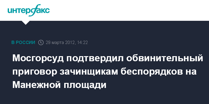 Москва. 29 марта. INTERFAX.RU - Обвинительный приговор по делу о беспорядках, произошедших на московской Манежной площади в декабре 2010 года, вступил в законную силу.