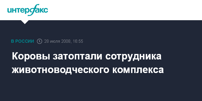 Псков. 28 июля. INTERFAX.RU - Hа животноводческом комплексе СХПК "Родина" в деревне Встеселово Псковской области коровы затоптали 58-летнего мужчину.