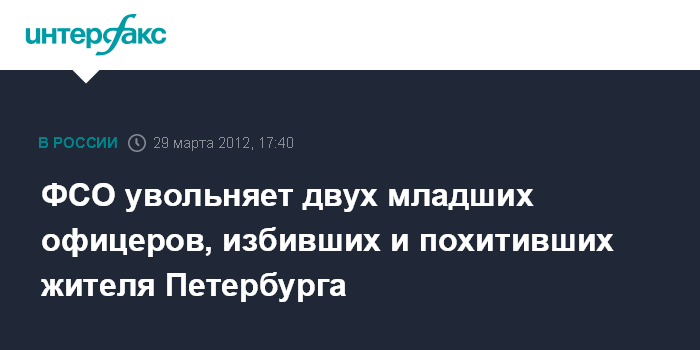 Москва. 29 марта. INTERFAX.RU - ФСО России признало дискредитирующим высокое звание офицера поведение двух младших офицеров ФСО, которые 24 марта в Санкт-Петербурге избили и похитили жителя города, вступившего с ними в конфликт на дороге. Они будут уволены.