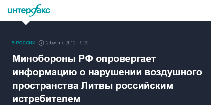 Москва. 29 марта. INTERFAX.RU - В российском военном ведомстве назвали не соответствующей действительности информацию о том, что 27 марта истребитель Су-27 якобы нарушил воздушное пространство Литвы.