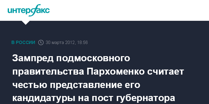 Красногорск. 30 марта. INTERFAX.RU - Первый заместитель председателя правительства Московской области Игорь Пархоменко считает большой честью представление "Единой Россией" президенту его кандидатуры среди кандидатов на пост губернатора региона. "Для меня это очень большая честь, и я расцениваю свою кандидатуру на пост губернатора как дань результатам, которых достигла Московская область. Объективно Подмосковье первое вышло из кризиса. Мы последовательно уменьшаем долговую нагрузку на область. В Подмосковье эффективно функционирует местное самоуправление. Международные эксперты высоко ценят национальный мир и спокойствие в регионе", - заявил Пархоменко журналистам.