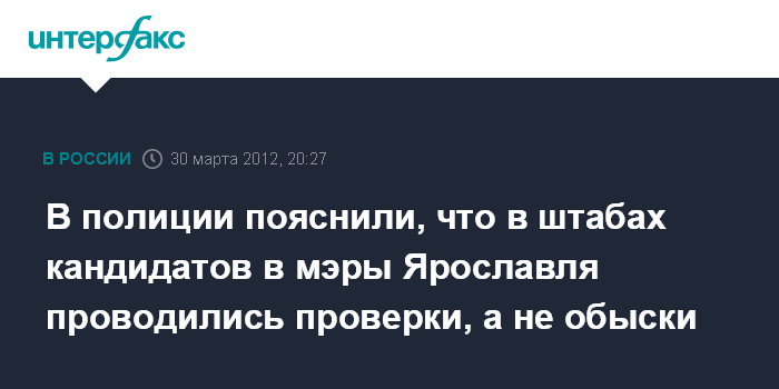 Ярославль. 30 марта. INTERFAX.RU - Информация о проведении обысков в помещениях избирательных штабов обоих кандидатов на пост мэра Ярославля не соответствует действительности, заявил "Интерфаксу" в пятницу начальник отдела информации и общественных связей УМВД России по Ярославской области Александр Шиханов. "Никаких обысков, а также препятствования деятельности штабов кандидатов не было", - заявил он.