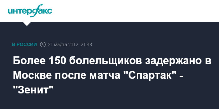 Москва. 31 марта. ИНТЕРФАКС - Сотрудники московской полиции задержали свыше 150 болельщиков после футбольного матча "Спартак" (Москва) - "Зенит" (Санкт-Петербург).