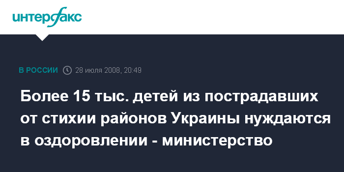 Киев. 28 июля. ИНТЕРФАКС-УКРАИНА - По предварительным данным, более 15 тыс. детей из шести пострадавших от стихии регионов нуждаются в оздоровлении, сообщает пресс-служба министерства по делам семьи, молодежи и спорта в понедельник.