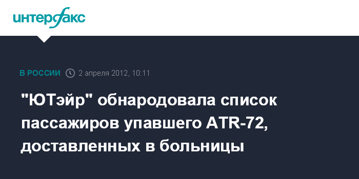 Москва. 2 апреля. INTERFAX.RU - Авиакомпания "ЮТэйр" опубликовала список доставленных в больницы Тюмени пассажиров самолета ATR-72, который 2 апреля в 5:33 мск при выполнении рейса ЮТ 120 из аэропорта "Рощино" разбился в трех километрах от аэродрома.