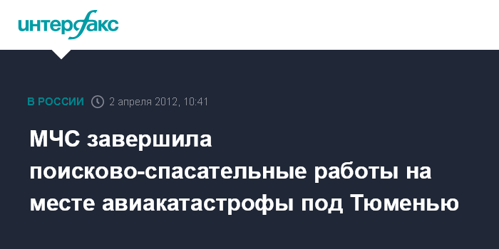 Москва. 2 апреля. INTERFAX.RU - Поисково-спасательные работы на месте крушения самолета ATR-72 под Тюменью завершены, сообщили "Интерфаксу" в ГУ МЧС по региону.
