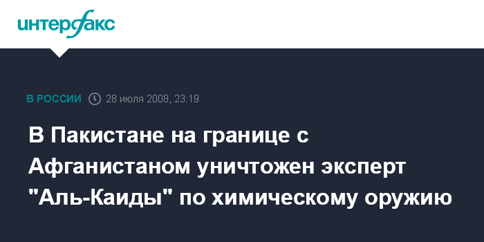Лондон. 28 июля. ИНТЕРФАКС - Один из ведущих экспертов "Аль-Каиды" в области химического оружия Мидхат Мурси ас-Саид Умар убит в результате ракетного удара, нанесенного по пакистанской территории на границе с Афганистаном.